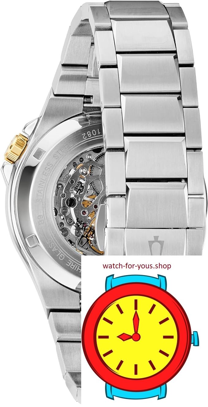 - Exposed skeleton dial features gold-tone hands and hour markers, single sundial, minute track, and Bulova detailing.