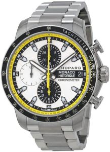 White dial enhanced by luminous hands. Grey titanium case with a gray titanium band. Automatic movement. 100 meters / 330 feet water resistance. Fixed Tachymeter Scale bezel. Scratch Resistant Sapphire crystal. Solid caseback. Deployment clasp. Screw Down crown. Case size 44.5 mm x 13.9 mm. Chopard 158570-3001 Grand Prix de Monaco Historique Chronograph Watch.